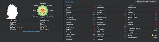 Taking a glance at his starting ratings Enes doesn’t look like a world class material player. But then again, if we take in consideration just the attributes needed for a quality striker, such as his Finishing (14), Composure (11), Flair (14), and Pace (12), we can say that this kid does show promise for a good future development. It depends from save to save on how he is going to develop, as he has Potential Ability attribute set at -9, which can range anywhere from 150 -180.
