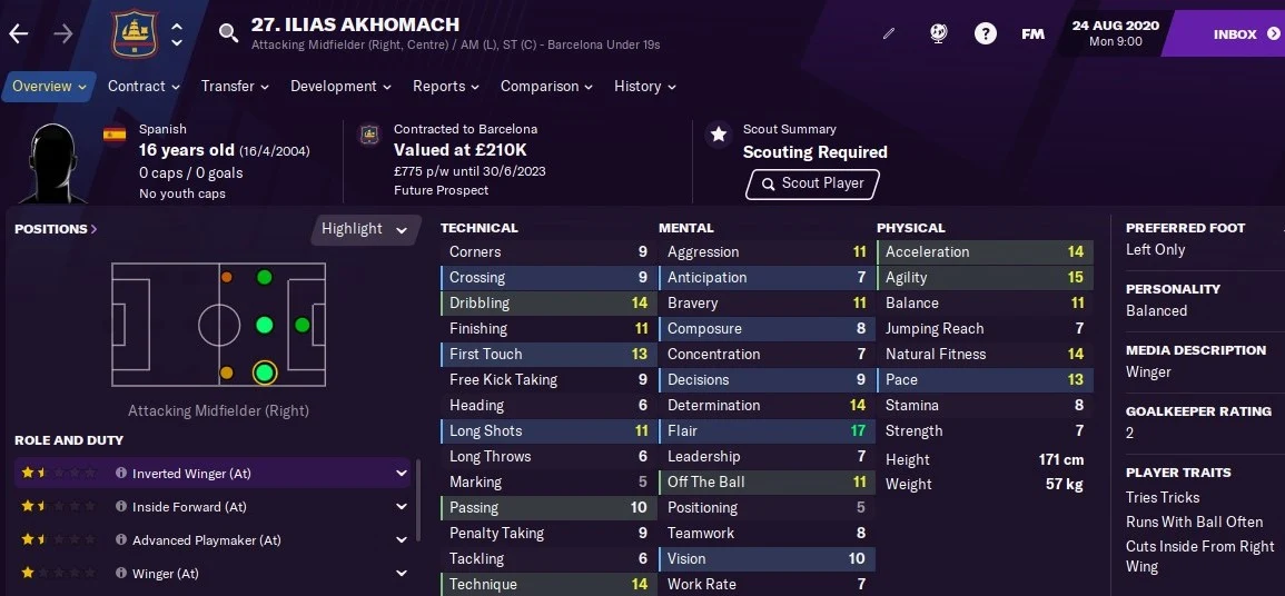 Ilias Akhomach is a Spanish Football Manager 2021 wonderkid who plays as a winger for FC Barcelona in FM21.