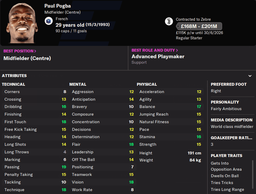 His explosiveness is gone, he is injury prone, and it has been months since Pogba has put together an impressive run of games. Expect his form to be matched by a major drop in almost every attribute, hidden or visible. Pogba simply hasn’t become the era-defining midfielder he was once anointed as.